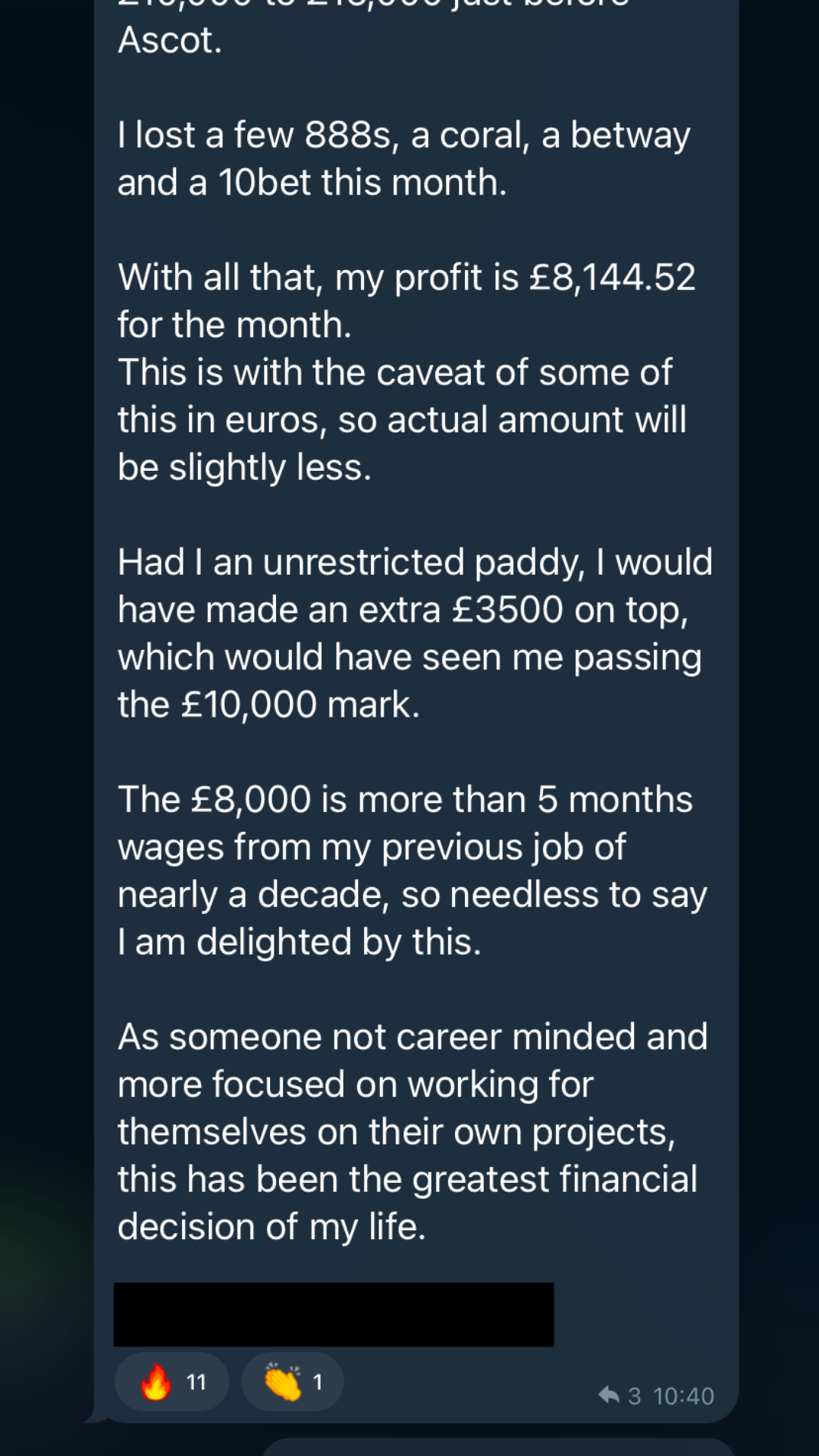 We’ve had members with modest bankrolls (£1k or less) and restricted accounts still make hundreds — even thousands — in their first months.